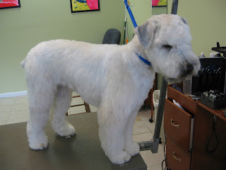 Here is a really beautiful Wheaten. His head looks a little bit strange because the last groomer had cut off his fall, so it was still growing back.